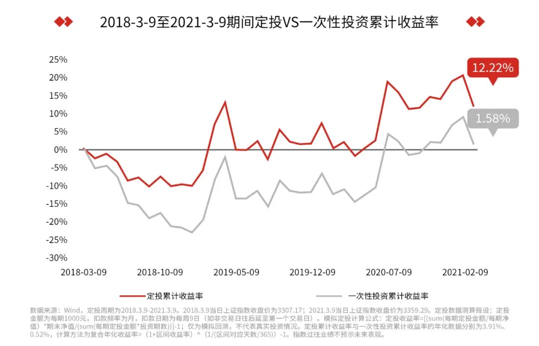 如果我们不想为择时而身心俱疲,那么定投或许是个好选择,相比一次性投入的方式,定投能够通过时间熨平短期波动,在市场波动加大的过程中通过分批、分散买入来追求摊薄成本、平抑波动的效果,以纪律的不变应对市场的万变。在2018年3月9日至2021年的3月9日的三年时间里,上证指数起止点位均为3300点左右,看似毫无收益,但如果我们采用定投方式来参与市场,投资或许就柳暗花明了。