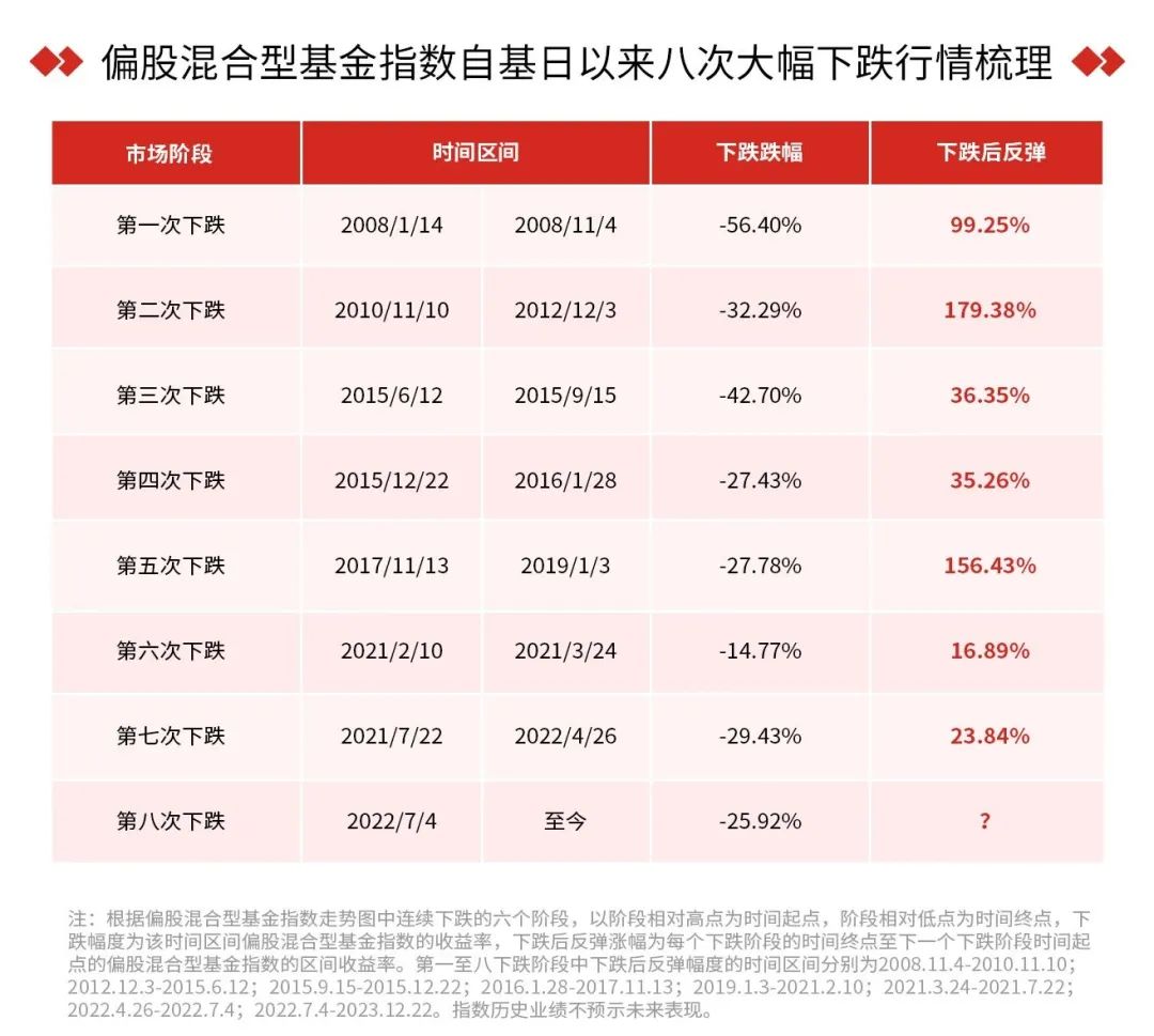 从偏股混合型基金指数的走势中就可以发现,自基日以来共经历过8次大幅的下跌行情,而之前每一次下跌后,反弹从未缺席。
