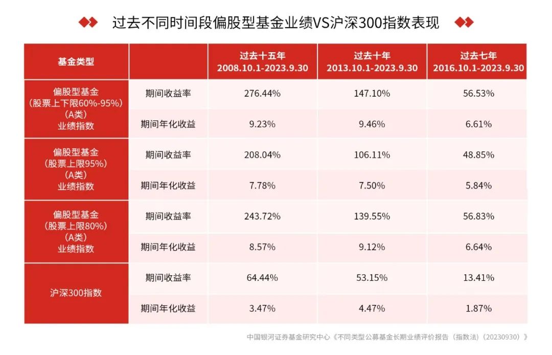 价值投资比的不是谁的动作更多、谁的交易更**,更重要的是比拼谁更有耐心。伴随着**经济的转型升级,A股更具长期向上的动力,其投资价值或将不断显现。目前来看,公募基金依然是A股市场上适合散户投资的**品种,银河证券基金研究**2023年10月9日发布的《不同类型公募基金长期业绩评价报告》显示,过去十五年、过去十年、过去七年偏股型基金均呈现不错的长期业绩: