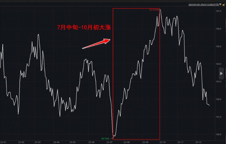 7 月中旬-10月初,由于美国经济再度超预期增长,十年期美债突破5%,全球金融市场风险偏好下行,海外流动性掉头向下,避险情绪高涨,美元指数强势走高。