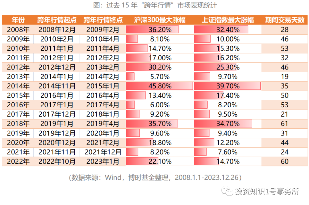 2、从跨度时间上看,期间交易天数从最短的19天到最长的61天不等,显示出不同年份的“跨年行情”持续时间有较大差异。