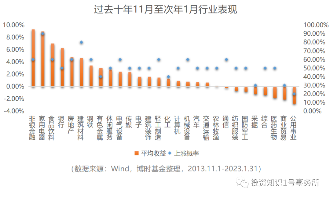 从过往十年来看,11月到次年1月期间,大金融(非银金融、银行)、消费(家用电器、食品饮料)、地产链(房地产、建筑材料)表现相对突出,平均收益排在前列。