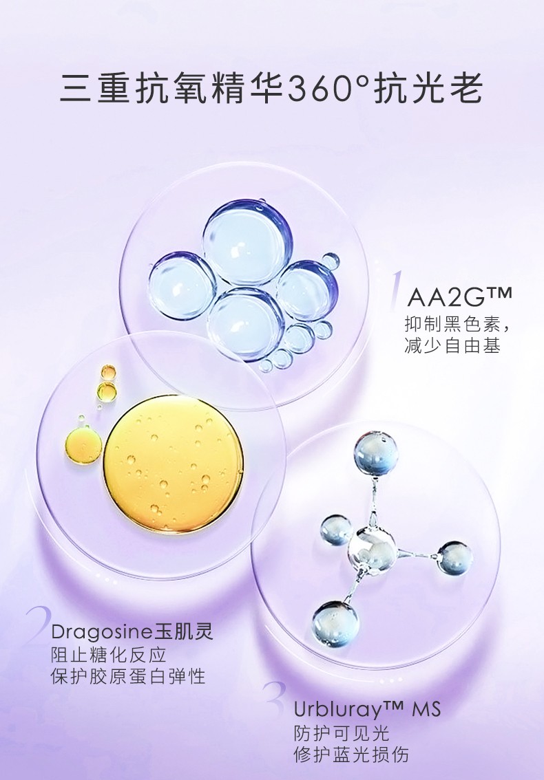 针对这个机制,Belli小紫瓶从从消灭自由基、防止氧化应激反应发生入手,搭建了360°抗光老体系,包括**2G™(L- 抗坏血酸 2-葡糖苷)一款稳定的VC衍生物,不仅能抑制黑色素的形成,还能大幅度减少肌肤受到阳光照射产生的自由基,抑制紫外线引起的皮肤损伤;Dragosine**灵(肌肽)天然的抗糖基卫士,能通过伪装代替蛋白质与糖发生糖化反应,保护胶原蛋白弹性;Urbluray™ MS(苜蓝茵)从地球上最能抗蓝光的植物中提取,对400-500nm的可见光有较好的防护效果,可以抑制蓝光诱导细胞产生过量活性氧ROS,减少和修护皮肤受到蓝光照射的损伤。