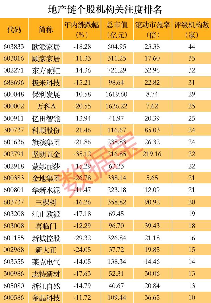 今天早盘地产链大幅上扬,房地产指数涨超1%,家用电器板块涨幅居前。数据宝统计出机构关注度较高的低位地产链个股。数据显示,年内跌幅超10%的地产链个股中,有22只个股评级机构数在10家以上。其中,欧派家居、顾家家居、东方雨虹等个股均有30多家机构评级。