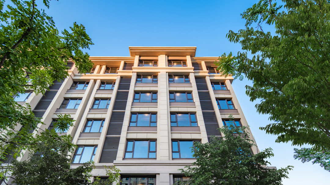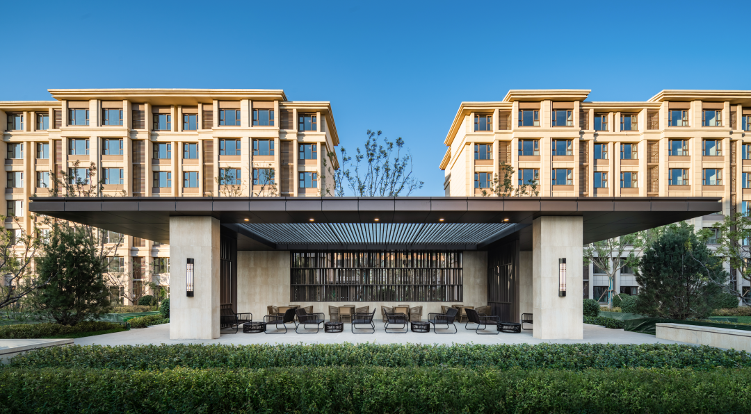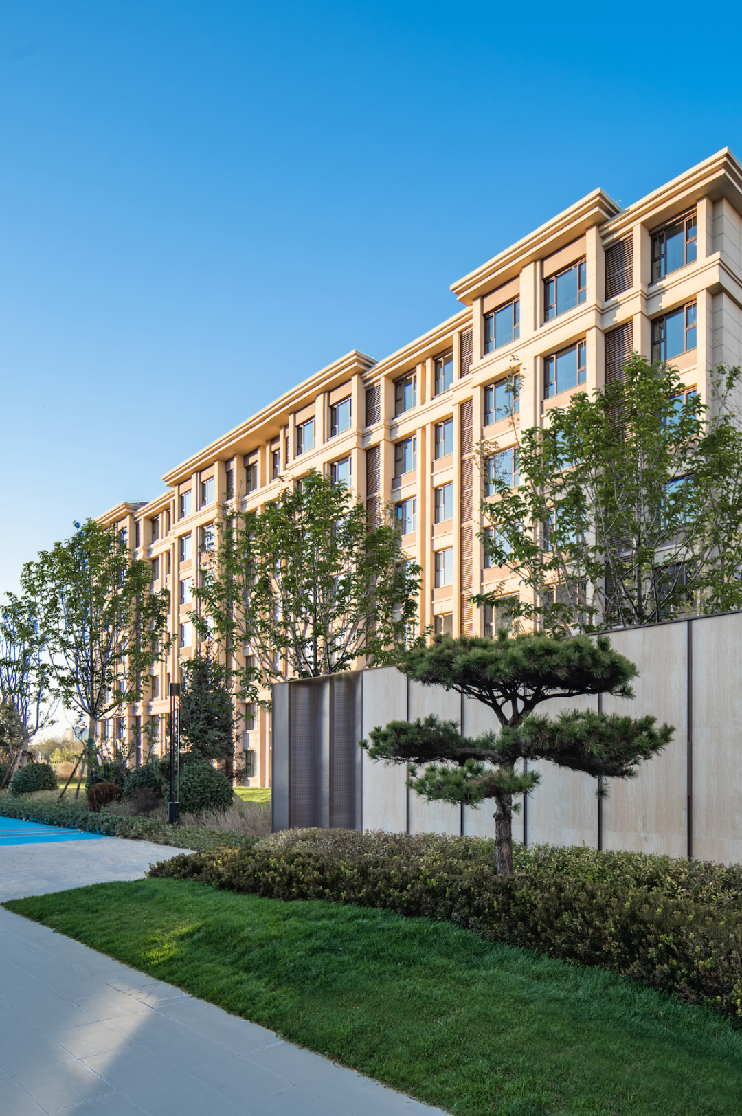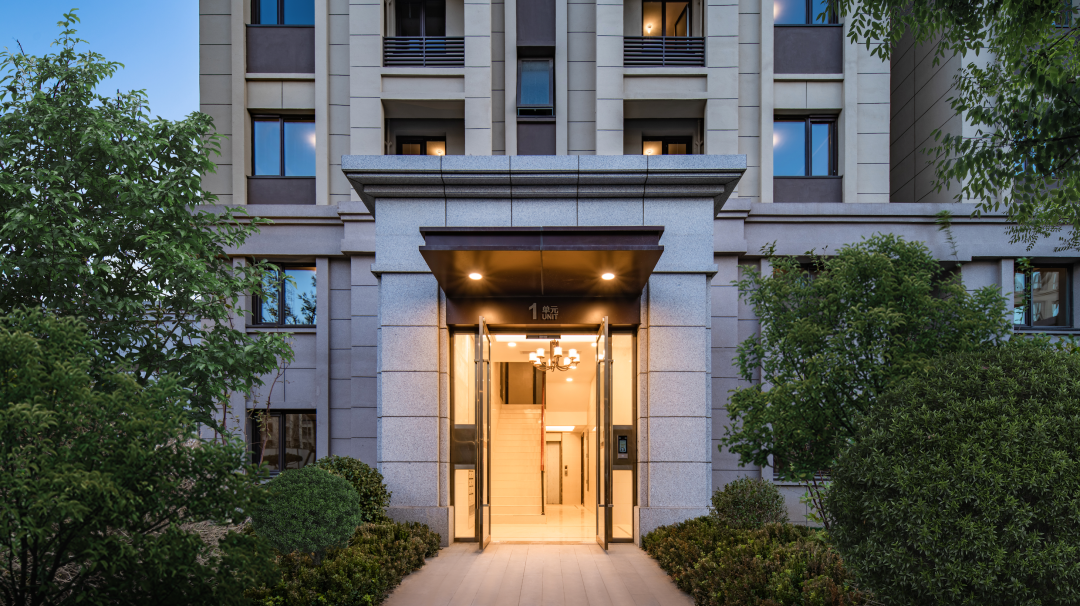 项目建筑立面为新古典主义风格,将古典的繁杂雕饰重新解构,结合现代感的线条与材质,呈现出质美并重的感官视觉。