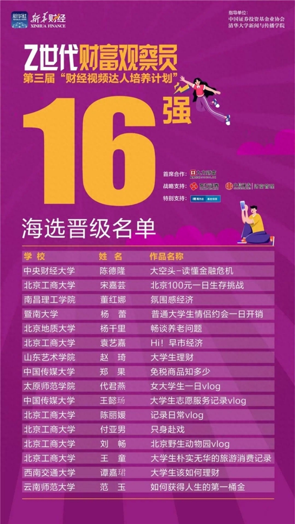 新华财经主办的“Z世代财富观察员&第三届财经视频达人培养计划”活动如火如荼的进行中。在经历了激烈的海选初评后,16强高校选手将角逐**赛事。活动的**合作方九方财富(09636.HK),将与东方证券、中信证券、易方达|基金投顾等金融机构一起,组建各自专家团队,分别助力选手们进行后续的财经视频创作。
