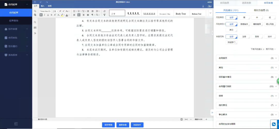 • 条款审查:提供条款智能识别、条款缺失性审查、条款规范性审查