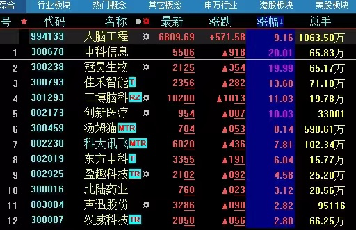 人脑工程方面,中科信息、冠昊生物20CM涨停,昨天大涨的三博脑科、创新医疗等涨幅都超过10%。