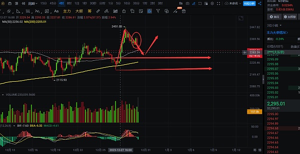 4小时线上看,以太跌破短线低点2179的机会不是很大,但从走势上看,跌破了1315位置,那这波回调将走进一步回调,回调区间在2285-2235,目前价格基本靠近2285位置,大饼如跌破短线低点41619位置,那行情也将进一步下跌到2235附近,后续跟随大饼一起做多单的布局,2235附近收下影线,多单即可做布局,晚间就不要多了,观望下方支撑到达情况,明日根据具体走势去做布局,自行把握进场机会;短线交易,控制风险,盈亏自理;