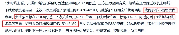 大饼昨晚下跌低点在42112位置,然后收针反弹,基本如预期,反弹的高点在43143位置,靠近反弹目标区间43150附近,后市行情虽然没有继续反弹走出突破,但这波短线的多单还是成功获利,晚间大饼再次下跌,跌破42100支撑,目前**点在41737位置,晚间关注下方破位;以太昨晚下跌低点在2311,昨晚也提示触及到2315附近就要开始走反弹,日内反弹高点在2388,虽然没有拉升突破,但是短线利润也还是有一点的,短线这个多单基本都是属于获利,晚间以太下跌跌破2315位置,目前**点在2290,以太将继续下跌试探下一支撑;恭喜跟上昨晚短线多单的朋友小赚一波,晚间关注低点破位;