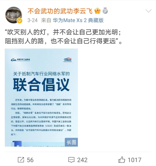 当天,李云飞转发了该倡议书,并附上评论:吹灭别人的灯,并不会让自己更加光明。阻挡别人的路,也不会让自己行得更远。