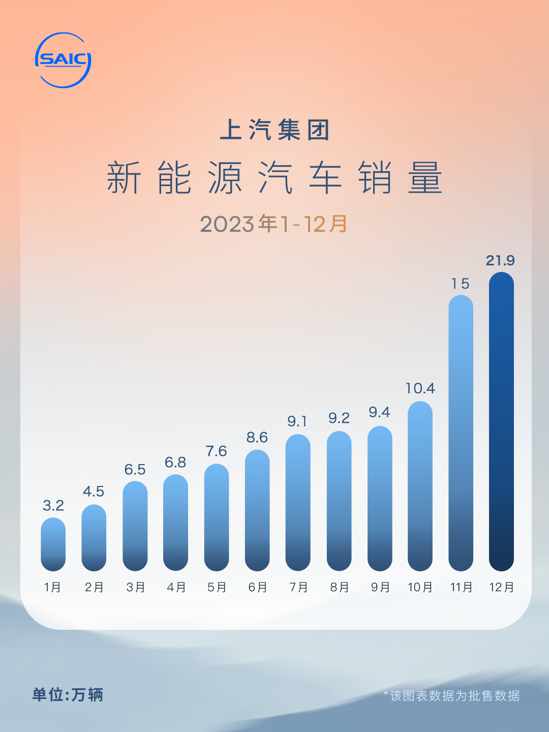 2023年12月份上汽集团新能源汽车销量达到21.9万辆
