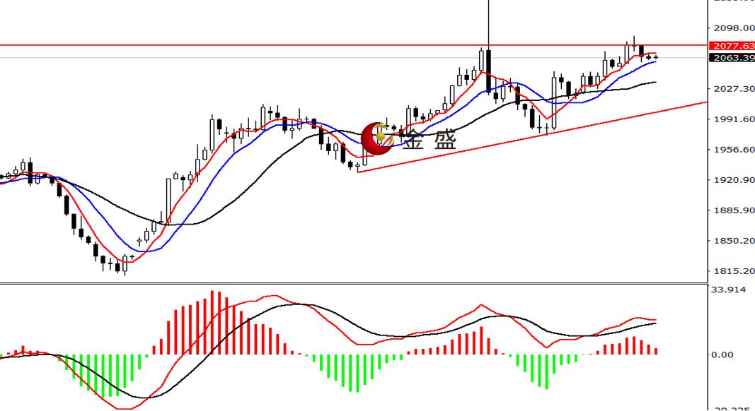 前一个交易日,白盘时段,黄金依托2060美元一带支撑震荡上行,午后价格围绕2070美元关口休整,并创日内高点2074.51美元后转跌,多头回吐早盘**涨幅。晚盘时段,市场波动性**,多空围绕2060美元一带震荡,价格**至2058.11美元,日图收小阴星。均线系统偏多头排列,运行在价格下方形成支撑。MACD指标快慢线零轴上方现金叉,做多的动能减弱。黄金连续两日调整,价格失守五日均线。下跌势能还未明显增强,短线或高位震荡蓄势,操作上高抛为主。