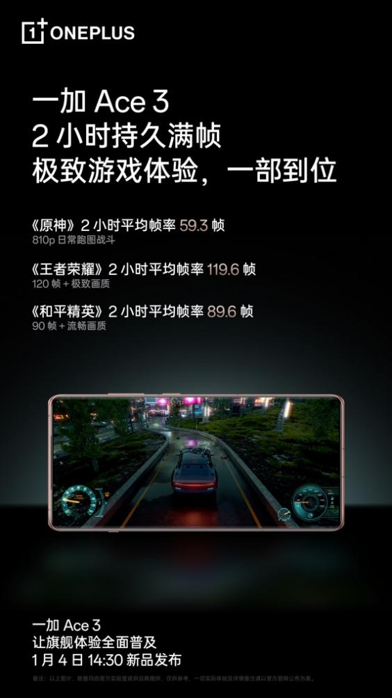 在 2 小时游戏测试中,一加 Ace 3 实现了《原神》日常跑图战斗场景平均帧率 59.3帧、《王者荣耀》平均帧率 119.6 帧、《和平精英》平均帧率 89.6 帧的好成绩,几乎全程流畅满帧运行,为用户带来极致游戏体验。