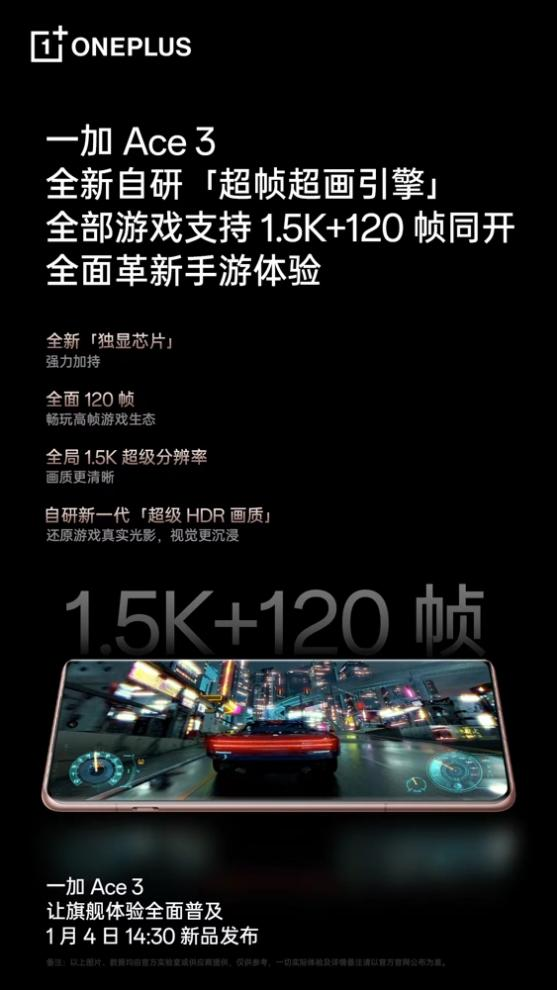 1 月 2 日,一加宣布一加 Ace 3 搭载第二代骁龙 8 旗舰芯片、16GB LPDDR5X 旗舰内存、1TB UFS 4.0 旗舰储存,打造同档位性能新**。
