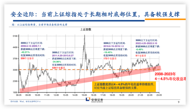 如下图,安信证券的报告显示,当前上证综指处于长期相对底部位置,具备较强支撑。