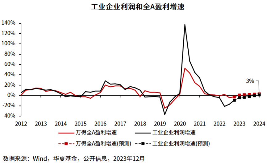 盈利方面。从历史经验来看,工业企业利润增速与全A盈利增速的趋势较为一致。从去年11月的数据来看,11月份规上工业企业利润同比增长29.5%,增速较10月份明显加快,利润已连续4个月实现正增长。(来源:**经济网)预计2024年工业企业利润将扭亏,全年利润增速预计达1.2%左右。