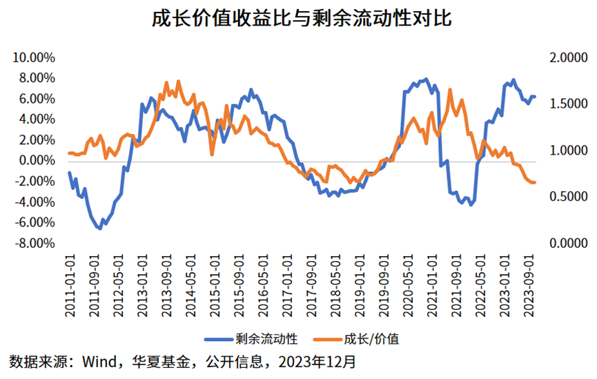 成长和价值的相对收益变化,主要受到剩余流动性的变化影响,因此剩余流动性的扩张会带来成长风格相对于价值风格收益的显著扩张。