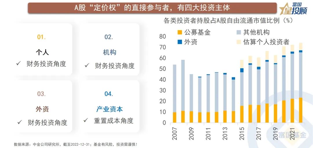 四大投资主体分别是个人、机构、外资,以及产业资本。而A股市场的制度与规则,则间接影响了各大主体之间的平衡。四大投资主体在交易逻辑上可分为两类:个人、北上以及机构是基于财务投资的角度,而产业资本则是重置成本角度。当然,A股的“定价权”也会在四大主体中出现迁移。比如:2014-2015年的“个人定价”时代、2016-2019年的“外资定价”时代、以及2020-2022年的“机构定价”时代。