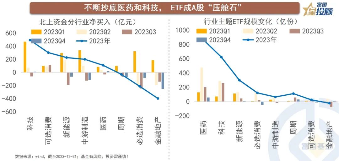 在行业结构上,外资与ETF的“焦点”也并不相同。外资除了在一季度“做多**”以外,2023年二季度和四季度均在离开A股市场。而外资的“焦点”,主要在科技与可选消费板块。不同于外资的“犹豫”,ETF资金则在坚定的**医药、科技与新能源板块。当然,由于**经济转型和“高质量”发展的总基调,无论是外资还是ETF,都在撤出必选消费、金融地产的方向。