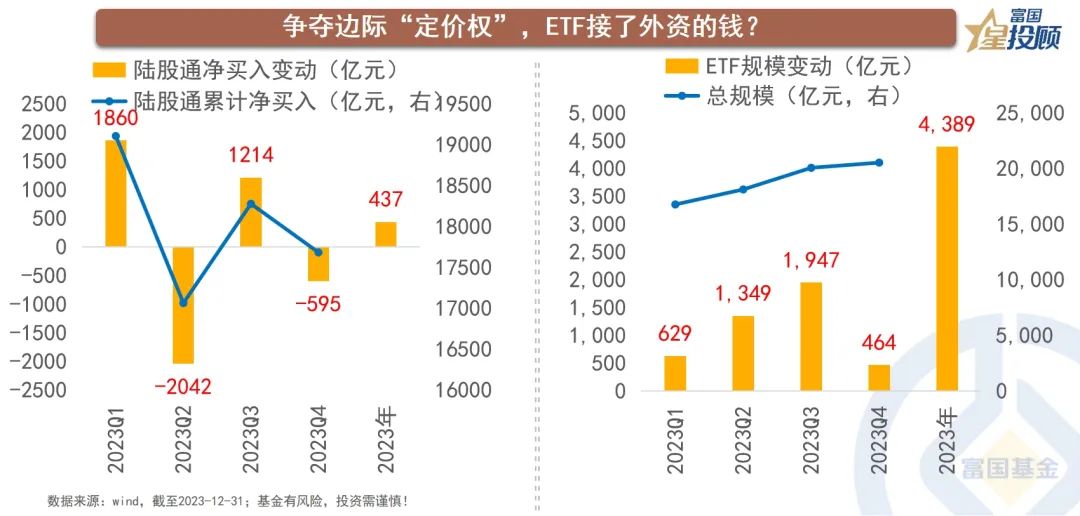 “定价权”往往属于持股增持比例提升最快的投资主体。2023年以来,外资阶段性的流出**市场,使得投资者对于“外资定价权”导致的下跌“忧心忡忡”。然而,从增量资金角度,2023年ETF基金全年规模增加4389亿元,持股比例的提升在所有机构当中“名列前茅”,成为“实至名归”的“吸金王”。在A股市场边际“定价权”的争夺中,ETF基金是“现在时”,而外资已成为“过去时”。