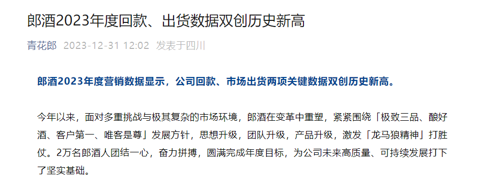 12月31日,郎酒官微发布消息透露:郎酒2023年度营销数据显示,公司回款、市场出货两项关键数据双创历史新高。