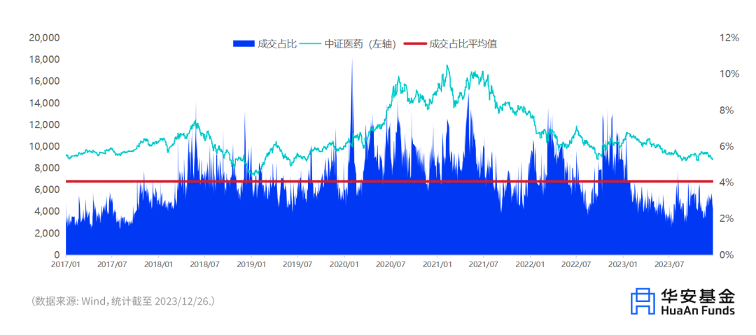 人多的地方必然拥挤,从成交占比来看,医药还处在“冷静”的区间。