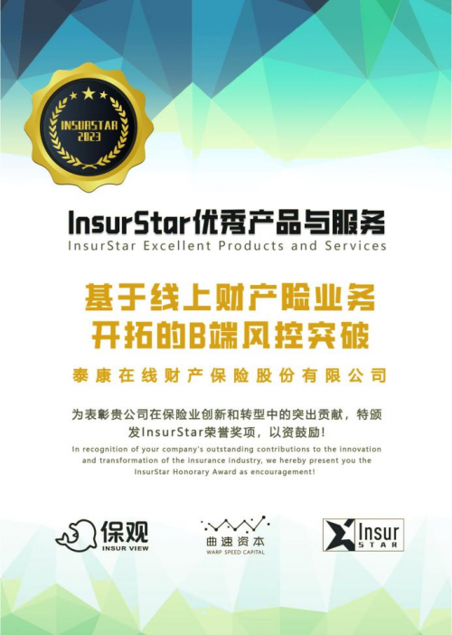 12月28日,历时一个多月的2023年InsurStar行业榜单征集与评选活动正式揭晓结果,互联网保险头部企业泰康在线荣获“InsurStar30”殊荣,同时泰康在线基于线上财产险业务开拓的B端风控业务斩获“InsurStar2023年度**产品与服务”荣誉。