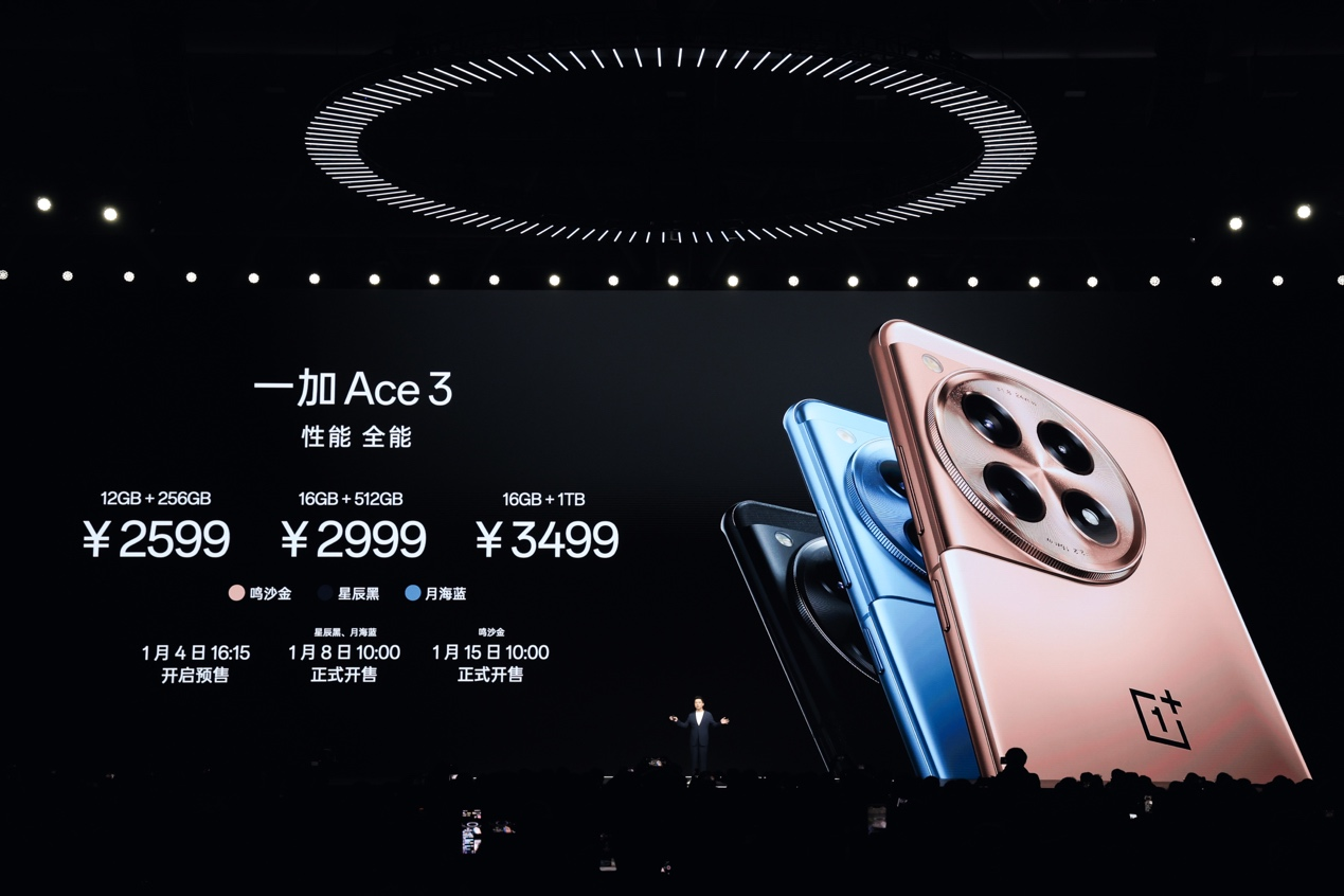 一加 Ace 3 星辰黑和月海蓝配色将于 1 月 8 日 10:00 正式开售,鸣沙金配色将于1 月 15 日 10:00 正式开售。1 月 4 日 16:15 一加Ace 3三款配色将在 OPPO 商城、京东、天猫、拼多多、抖音等平台开启预售,首批购机用户可享限时分期免息、屏碎保两年五折购与以旧换新等丰富服务。