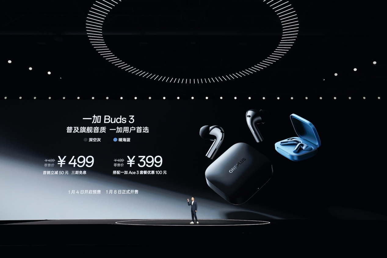 一加 Buds 3 耳机将于 1 月 4 日开启预售,1 月 8 日正式开售,售价 499 元,首销立减 50 元,搭配一加 Ace 3 购买优惠 100 元。一加 Ace 3 全包保护壳系列将于 1 月 4 日 16:00 正式开售,素皮质感全包保护壳售价 99 元,手机加购价 69 元;砂岩质感全包保护壳,售价 99 元,手机加购价 69 元;经典纹理全包保护壳,售价 69 元,手机加购价 39 元。