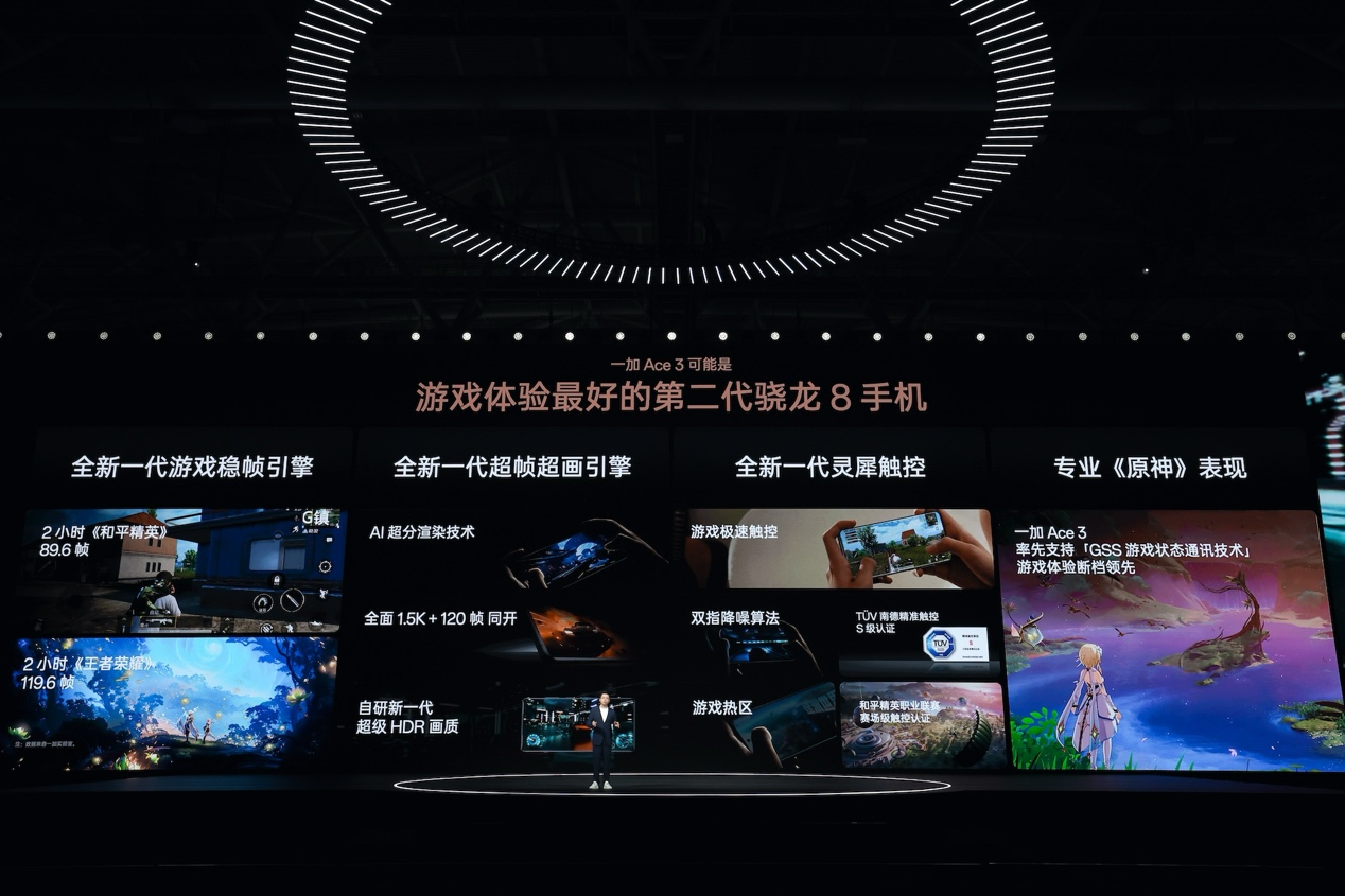 一加 Ace 3 搭载独显芯片,配合全新一代「游戏稳帧引擎」、「超帧超画引擎」与「灵犀触控」,可针对游戏指令进行资源合理化重新分配,提升图形渲染效率,实现了所有游戏 120 帧超帧和 1.5K 超级分辨率同开,达成了双指百万次 0 断触,普及了新一代自研超级 HDR 画质,为游戏玩家带来长时间的流畅满帧、清晰自然的游戏画质与多手指跟手稳定。