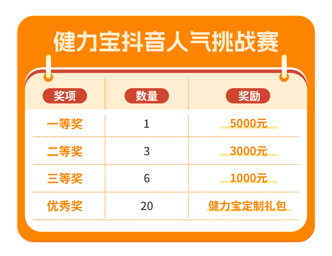 同学们可将作品同步发布在抖音平台,有机会赢得企业准备的特别大奖。需要注意的是,发布时必须带话题#尽兴劲爽健力宝,并 @健力宝官方旗舰店(抖音号:jianlibao828)。该奖项后续由企业方综合抖音互动数据及作品质量进行评比,奖项及奖金设置如下: