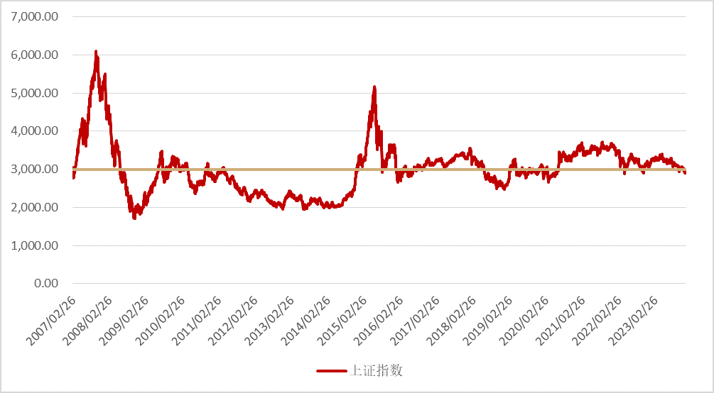 近期市场持续磨底, “3000点保卫战”的口号再一次出现,实际上,自2007年2月26日上证指数(000001.SH)**次站上3000点以来,保卫战几乎每年都会打响。下图为2007年至今的上证指数走势,可以看出该指数长期围绕3000点上下波动,通过计算也能得到近16年来的指数均值为3007.12。