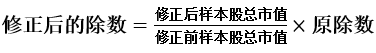 其中,修正后样本总市值=修正前样本总市值 新增(减)市值,由此得出新除数,并据此计算以后的指数。