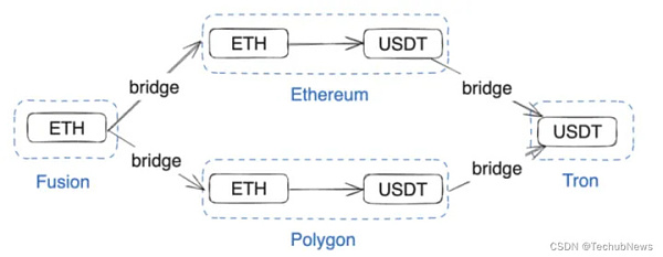 Chainge Finance 则更进一步,在多跳的基础上,支持把订单拆分给多个链上的流动性池,共同完成交易。例如用户需要将 Fusion 链上的大量 ETH 换成 Tron 链上的 USDT,系统可能会拆分到以太坊和 Polygon 上,分别完成兑换之后,再为用户将 USDT 传输到 Tron 链上。