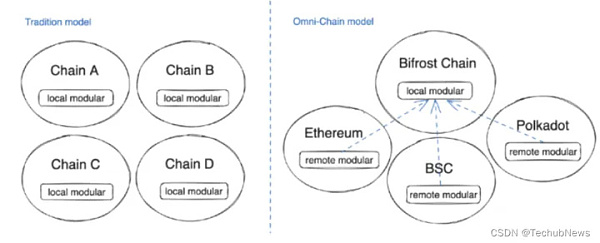 在这种结构下,应用程序并不需要在所有链上重复部署实例,而是仅在一条链上部署核心模块(总店)的同时,在其他链上部署一个轻量化的远程模块(分店)。**其他链的用户都通过跨链的方式远程访问应用程序,获取服务。