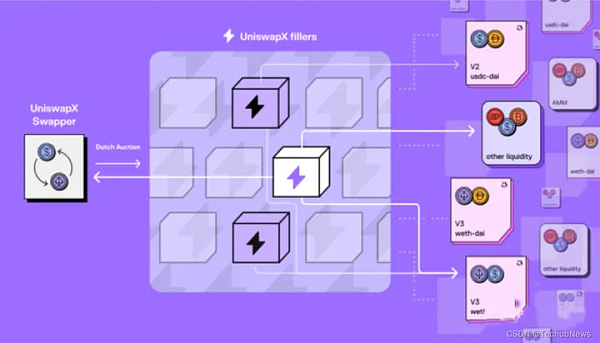 采用此方案的典型案例是 Uniswap X。Uniswap X 是 Uniswap Labs 于 2023 年 7 月发布的新产品。在官方的描述中,Uniswap X 是一种新型的无需许可的、开源的、基于荷兰拍的聚合交易协议,用于跨 AMM 和其他流动性来源为用户提供服务,具有无 Gas、无滑点、抗 MEV 等优势。