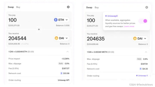 Uniswap 官网界面已经有开启 Uniswap X 的按钮,用户可以点击右上角小齿轮手动开启,目前仅支持以太坊网络。