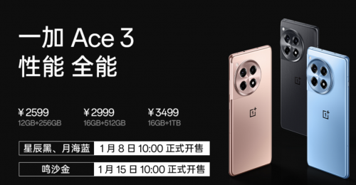 一加持续秉持「产品力优先」理念,让旗舰性能的**普及,既有强大的产品力,也有极具诚意的价格。一加 Ace 3 星辰黑和月海蓝配色将于 1 月 8 日 10:00 正式开售,鸣沙金配色将于 1 月 15 日 10:00 正式开售,12GB 256GB 版本售价 2599 元,16GB 512GB 版本售价 2999 元,16GB 1TB 版本售价 3499 元。