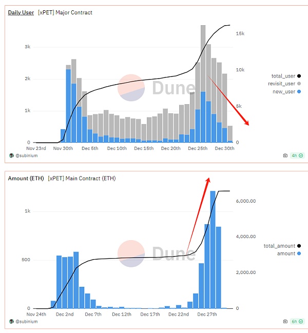 12月25-12月29日这波**拉升,就非常的冥想,用户新增量在12月26日到达**,之后两天开始减少。而12月27-12月29日链上出现巨量的借贷,**币价到达3.25U后闪崩到1.35U。