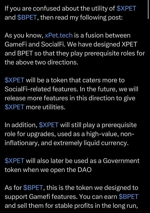 至于BPET,这是我们设计用来支持Gamefi功能的**。您可以赚取BPET并长期出售以获取稳定的利润。这对你的投资非常有利,因为实际上想要获得XPET将会非常困难。因此,目前增加BPET的流动性将是为了用户利益的正确选择。