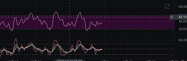 那么RSI趋势线在中轴线附近波动幅度减弱,趋势线端口钝化,下行空间逐步压缩。KDJ同样三线粘连。走势角度平缓。都预示着本轮回调可能即将结束。行情走势有望近期某时段打开