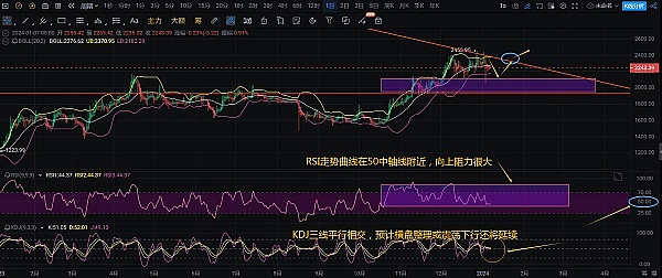 现在是北京时间2024.1.7号上午12.30分。当前看下ETH日线级别走势。价格K线方面在布林带中下轨间弱势震荡,下方矩形涂色条框上沿2130附近是这轮反弹2450附近的多头强力支撑部位。也就是说在市场面没有二次做**提,**回踩深度**于此或者破位后也会很快反弹回升。即使插针下方2060附近也只是一瞬间便很快拉升回到2200上方。可见本轮回调快但持续性不强,一旦市场回暖2300上方依旧是价格**。所以大家也不必盲目悲观,希望不要被A股市场这个宇宙级别现象所带偏