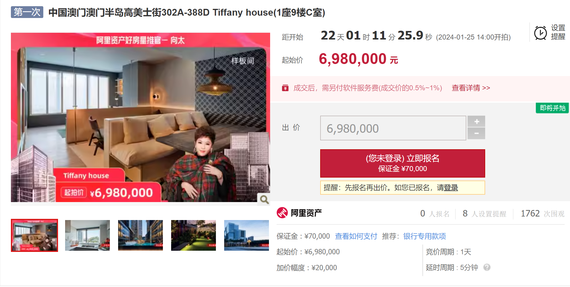 1月2日,澳门豪宅Tiffany house**上架阿里资产,共3套全新住宅,**8折起拍,将于1月25日1开拍,竞价24小时,1月26日结拍。
