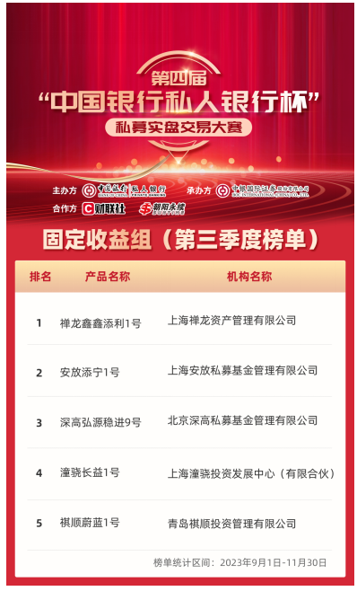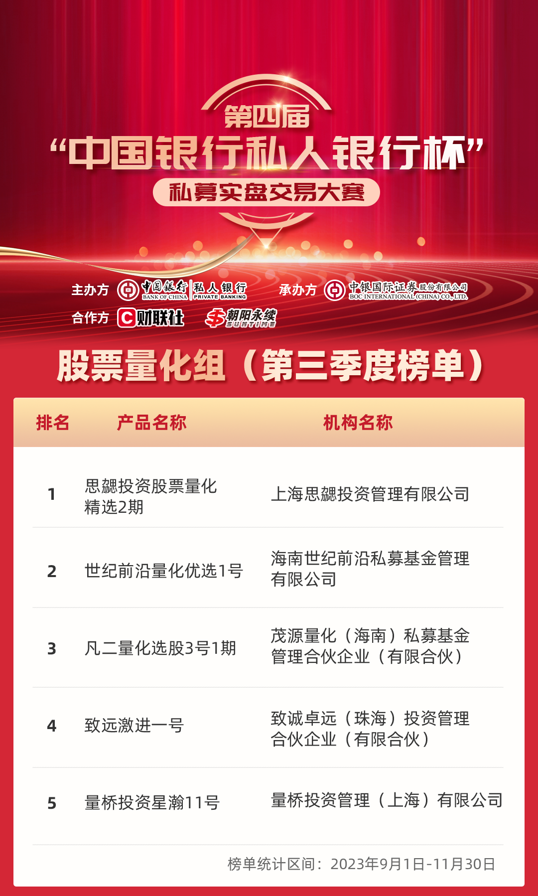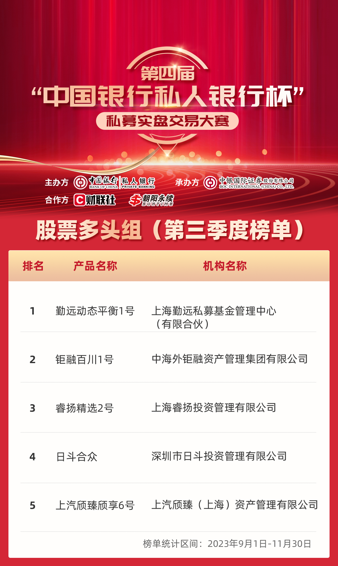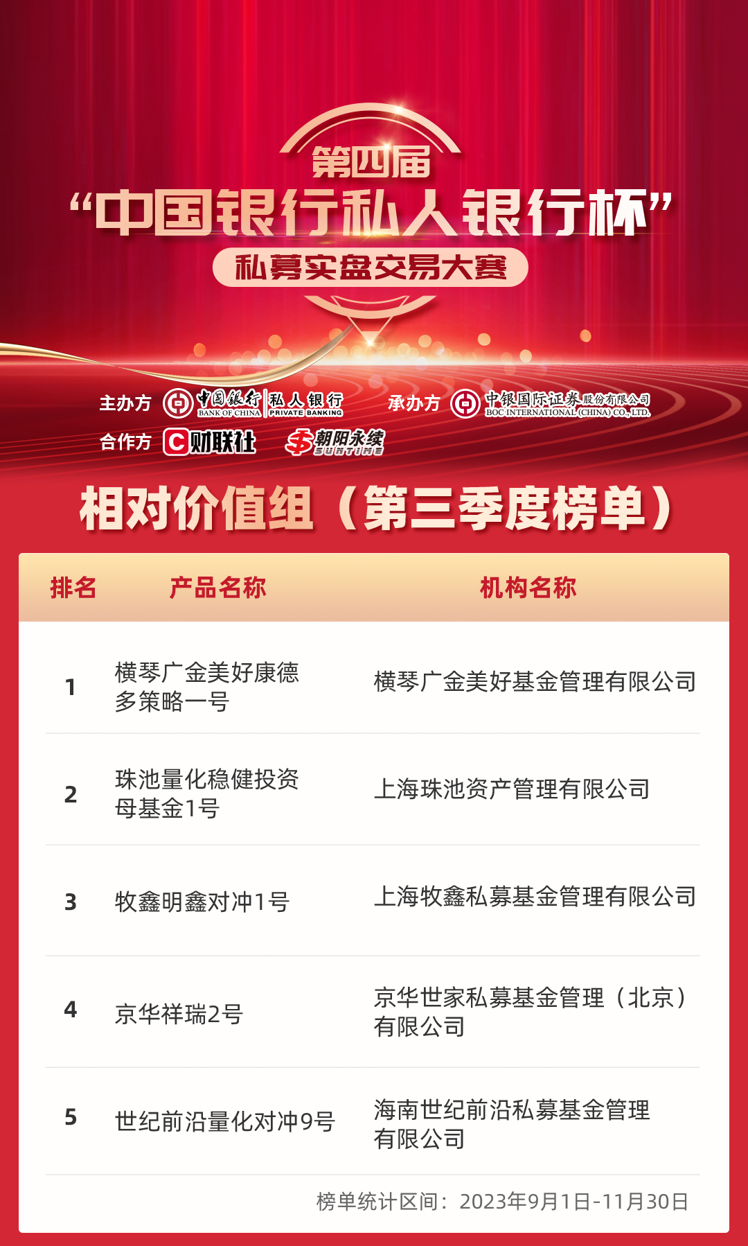 第四届“中国银行私人银行杯”私募实盘交易大赛三季度榜单发布!