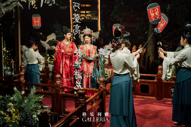 格乐利雅<宋·水上汴京>婚宴完整复刻了宋制婚礼,众多专家通过对古代历史的研究和解读,将“却扇礼”、“奠雁礼“、”夫妻交拜“、“结发”、“合髻”、“交卺”、“撒五谷”等宋制婚礼特色进行一一展现,这不仅在日常中极为罕见,在行业内也堪称首屈一指。为了在婚礼上带来更好的沉浸式体验,灯光布置专业,光线柔和且极具表现力,通过灯光模拟出当年汴京夜间的繁华景象,场景布置更是凝聚了山水仙鹤、亭台楼阁、曲水流觞等元素,这些元素营造出高雅不浮夸的感觉,并通过宫廷宴会的形式表现出来。现场还搭配了精致餐食与雅瓷器皿,同时推出焚香、插花、挂画、点茶等宋式沙龙,兼顾了色香味形,每个人都能有极好的参与感。区别于传统的婚礼就餐模式,多元化、多样化、细节化才是格乐利雅所追求的。