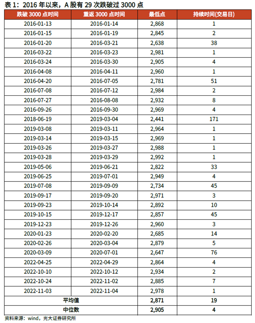 从跌幅来看,上证指数跌破3000点后,继续下跌的空间通常不大,**点的中位数为2905点,平均值为2871点。