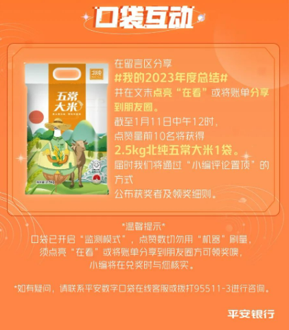 在留言区分享#我的2023年度总结#并在文末点亮“在看”或将账单分享到朋友圈。截至1月11日中午12时点赞量前10名将获得2.5kg北纯五常大米1袋。届时我们将通过“小编评论置顶”的方式