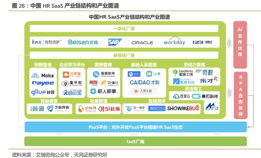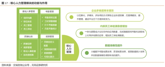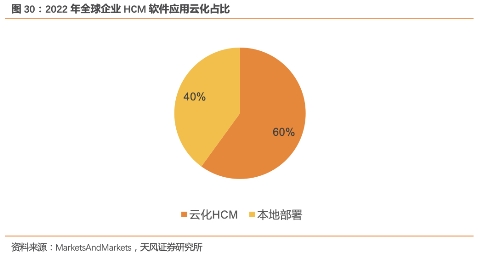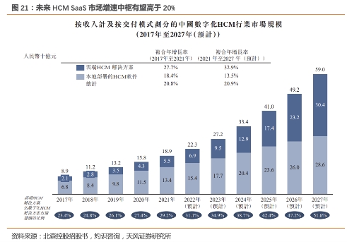 2021年**HCM市场规模约189亿元,其中云端HCM解决方案市场规模为55亿元,约占整体市场的29%,相较美国60%的SaaS比例仍有提升空间。HCM软件市场的一体化与转云化趋势显著,结合数字化趋势,我们认为HCM SaaS未来有望长期保持较高的行业增速。同时在经济增速放缓的大背景下,Core-HR和绩效管理等模块呈现出高于整体市场增速的特性,逆周期属性明显。