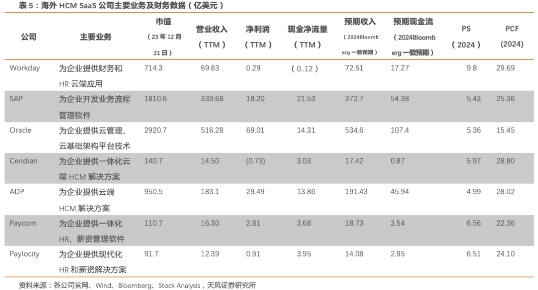 海外HCM公司有多家上市公司以云化、一体化的人力资源软件来为客户开展人力资源服务。总结上述HCM产品或公司,在全球来看,我们认为一体化已经被验证为HCM SaaS市场的明确发展趋势。其次,海外HCM SaaS市场的容量较大,有多家上市公司(Ceridian、ADP、Paylocity)通过云端HCM解决方案获得超过10亿美金的收入。此外, 从整体估值水平来看, 海外HCM SaaS公司到2024年的P/CF倍数预计在25-30倍范围内(Workday、SAP、Ceridian、ADP),PS倍数为在6-10倍范围内(Workday、Oracle、SAP、Ceridian、Paycom、Paylocity),其中ADP PS偏低,主要系公司有大量的薪税服务业务。